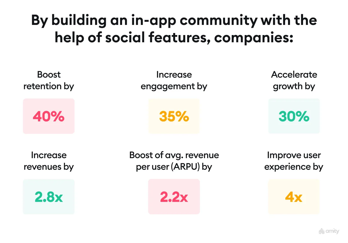By building an in app community with the help of social features, companies boost retention by 40%, increase engagement by 35%, accelerate growth by 30%, and increase revenues by 2.8x!