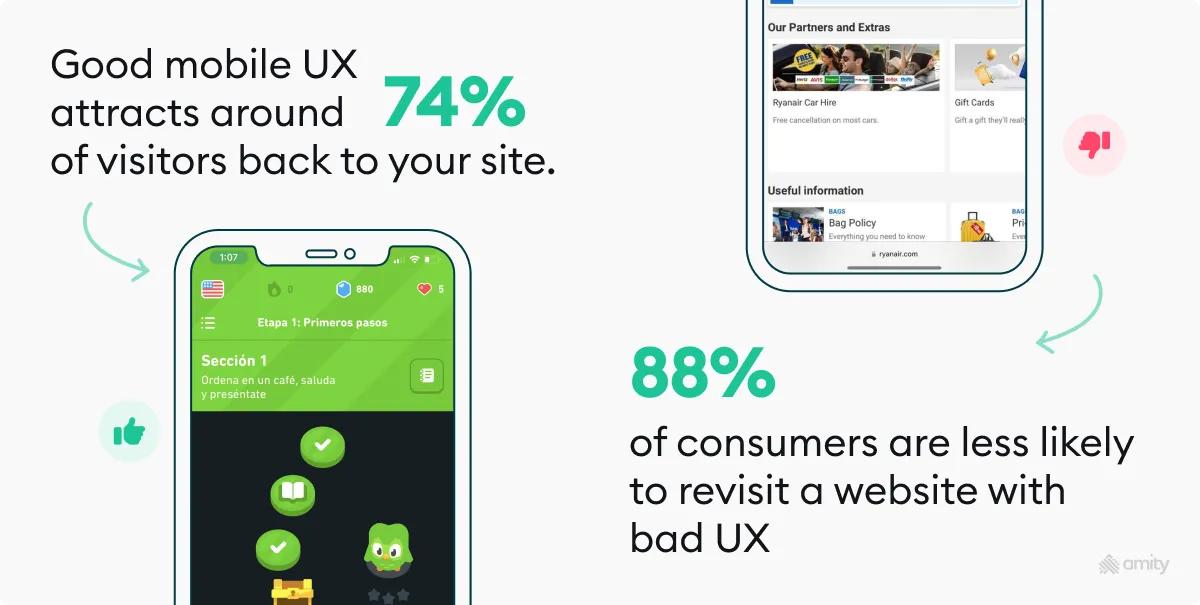 - Good mobile UX is like a magnet. It attracts around 74% of visitors back to your site.