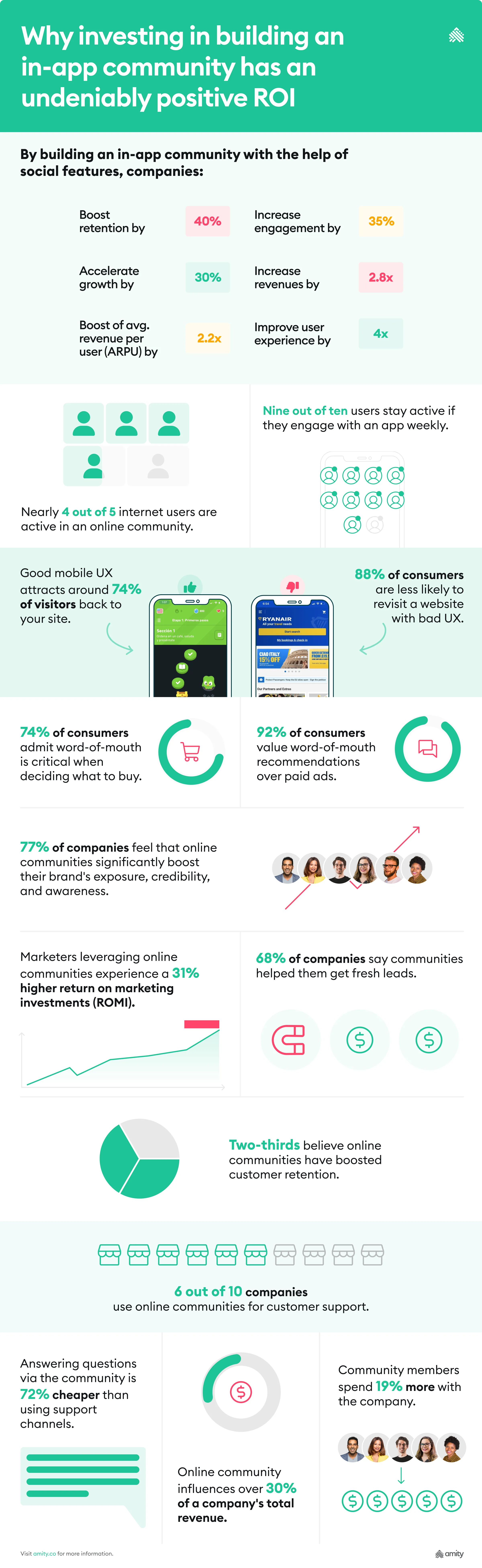 Forrester reports that every $1 invested in UX results in an ROI of 9,900%. Weaving in an in-app community will help morph your app into a vibrant social hub that brings users back time and time again.